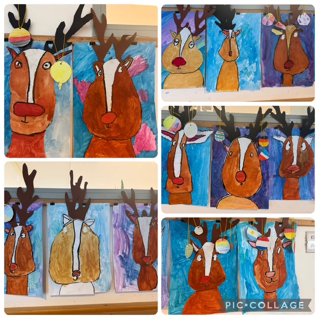 Rentiere mit Weihnachtskugeln aus dem Kunstunterricht