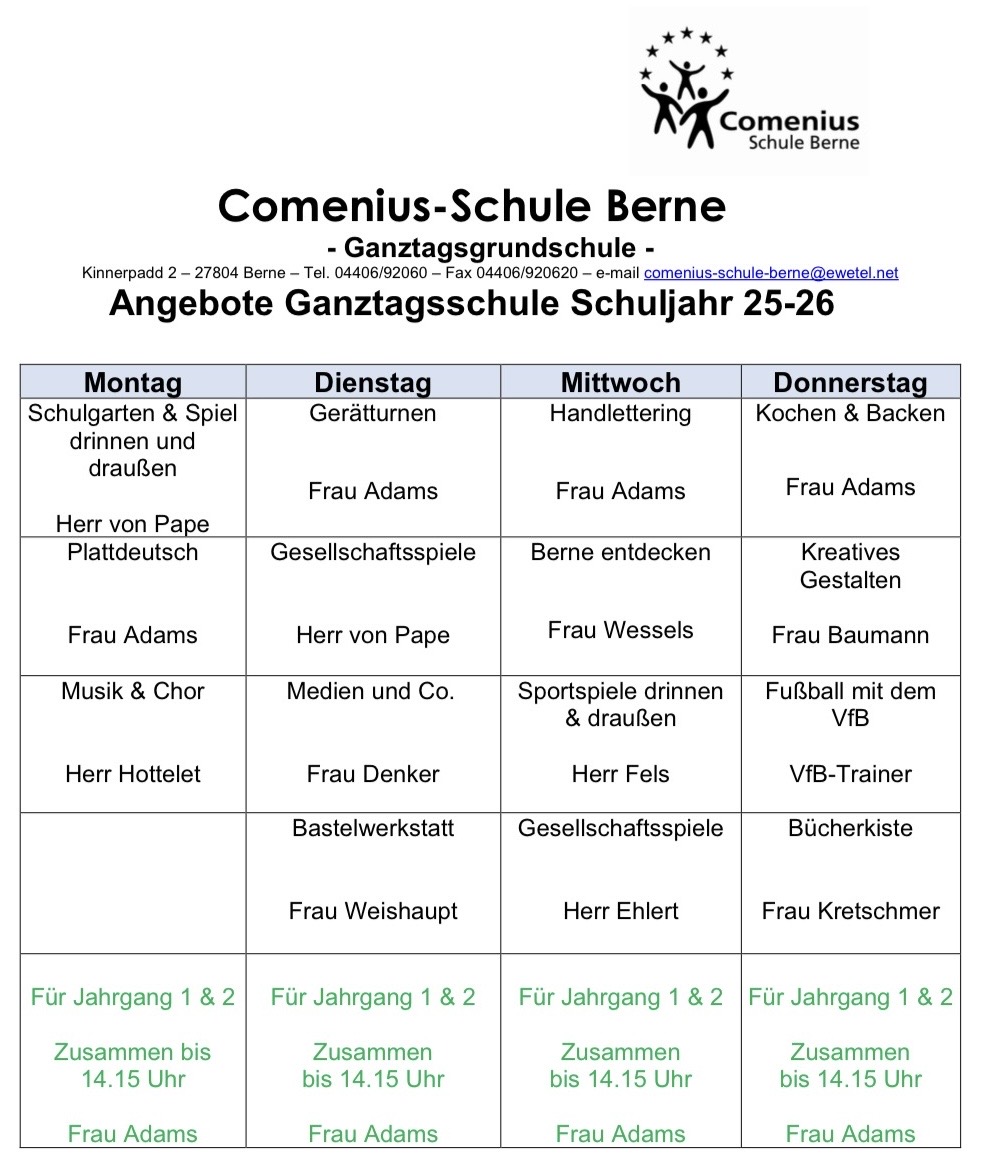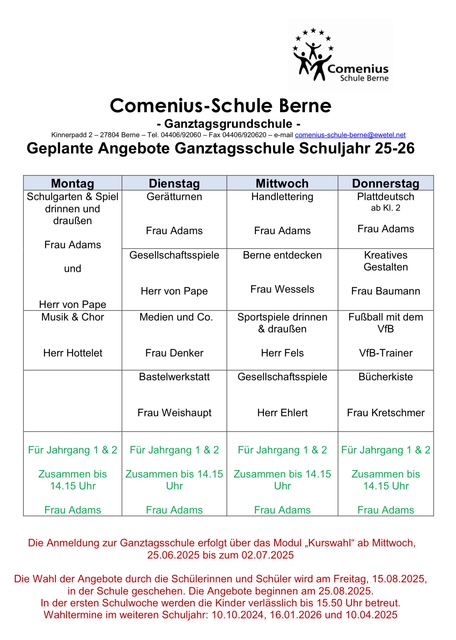 Überblick über die Angebote der Ganztagsschule im Schuljahr 2025/2026