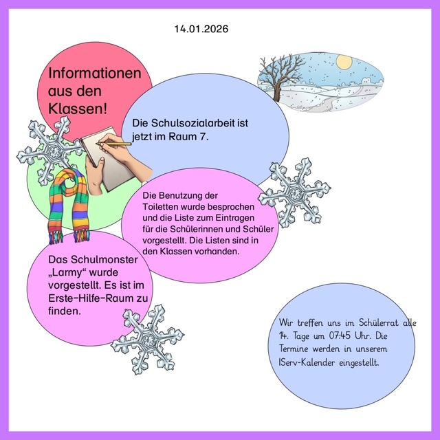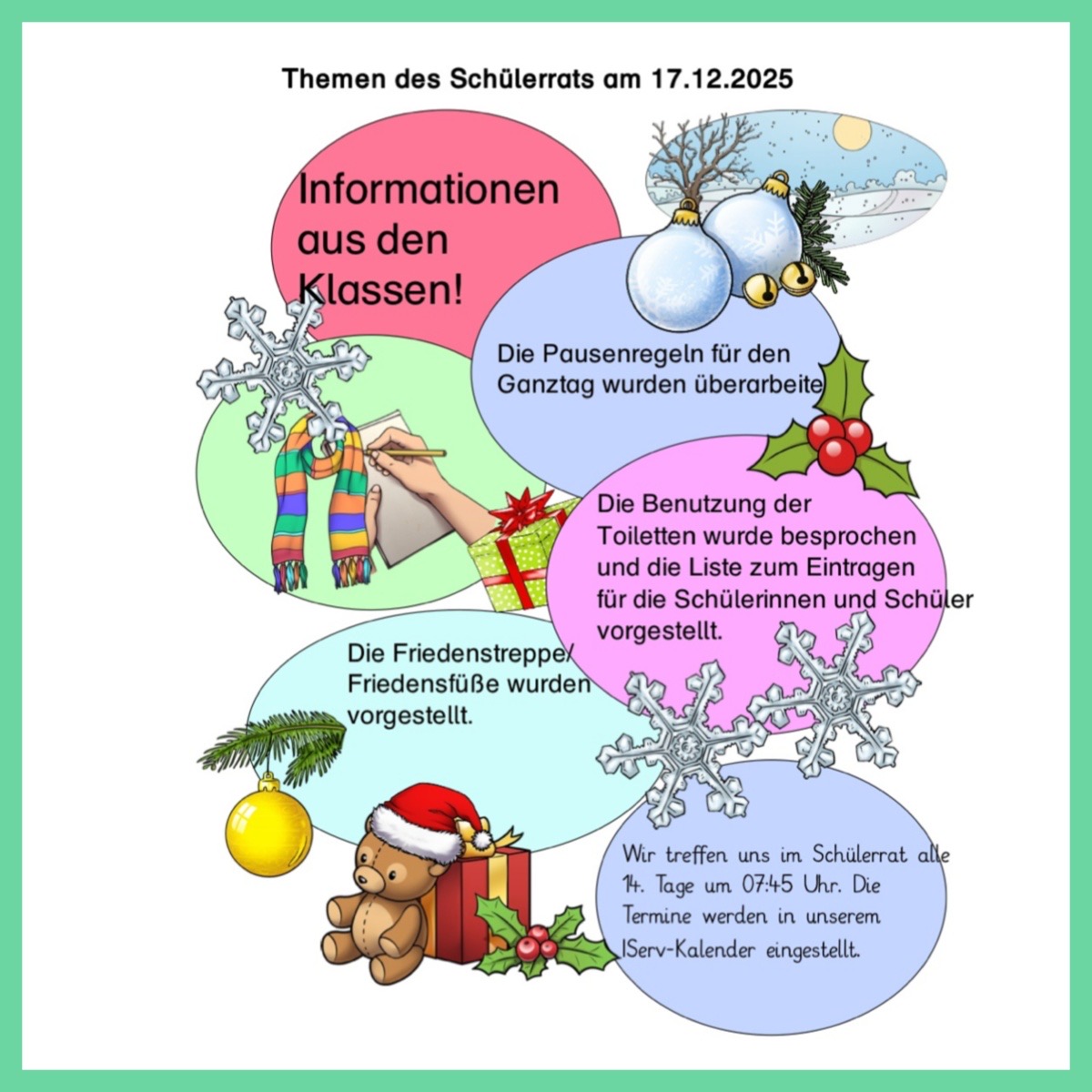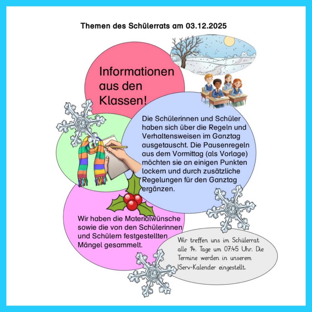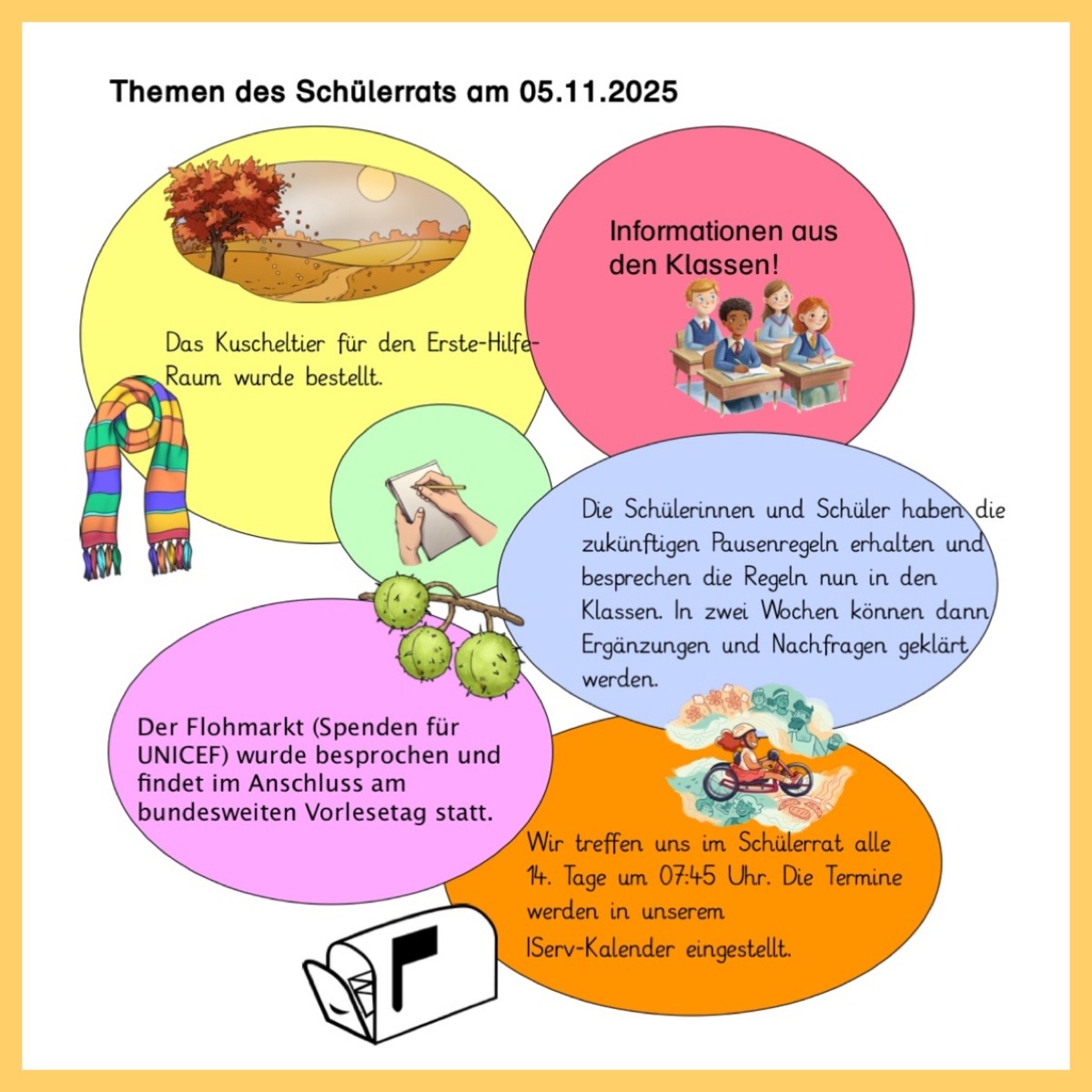 Der Schülerrat trifft sich immer regelmäßig im Musikraum. Durch den Schülerrat werden die Interessen der Schülerinnen und Schüler an unserer Schule vertreten; die Kinder erhalten hier die Möglichkeit, das Schulleben aktiv mitzugestalten, d.h. Vorschläge zu bestimmten Bereichen zu machen, mitzuentscheiden, Probleme aufzuzeigen und an entsprechenden Lösungen mitzuarbeiten.